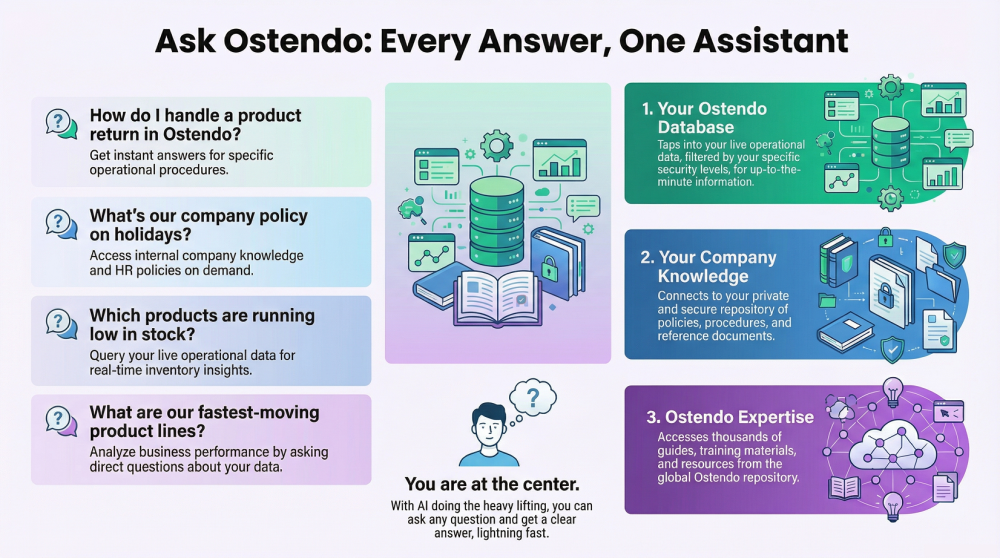 In every business, time is lost every day searching for answers—“How do I do this in Ostendo?”, “Where’s the latest policy?”, “Why is that product out of stock?”