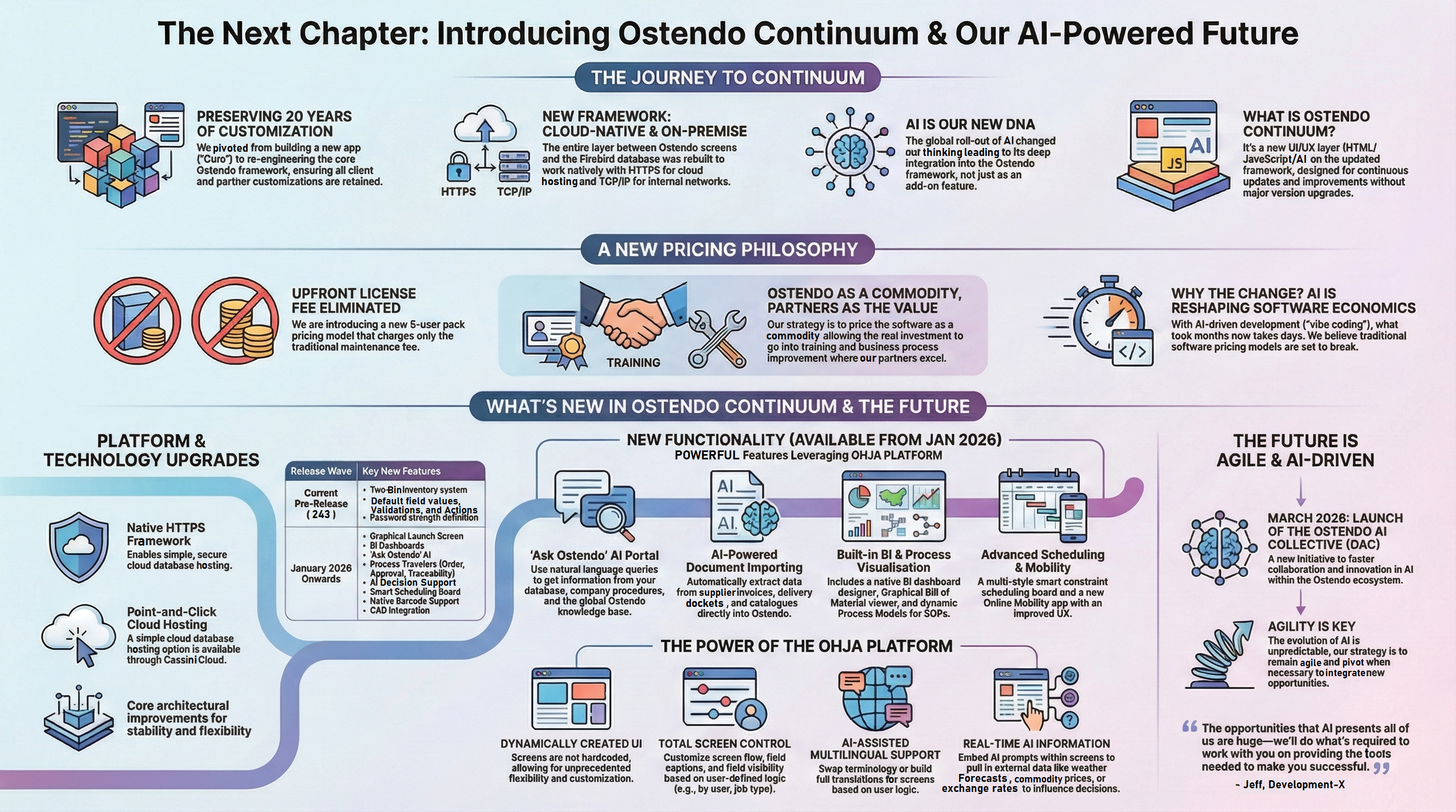 The Ostendo Continuum Development Roadmap outlines the planned evolution of Ostendo’s next-generation ERP platform. It provides visibility into upcoming capabilities, platform enhancements, and AI-driven innovation—helping organisations plan upgrades, align internal projects, and confidently invest in the future.