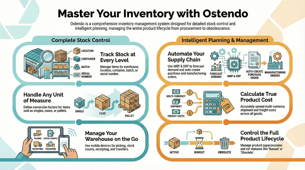 Effective inventory control and warehouse management are critical to profitability, customer satisfaction, and regulatory compliance. Ostendo Continuum ERP delivers a fully integrated, end-to-end solution that gives organisations complete visibility and control over inventory — from initial receipt through storage, picking, dispatch, and after-sales service.