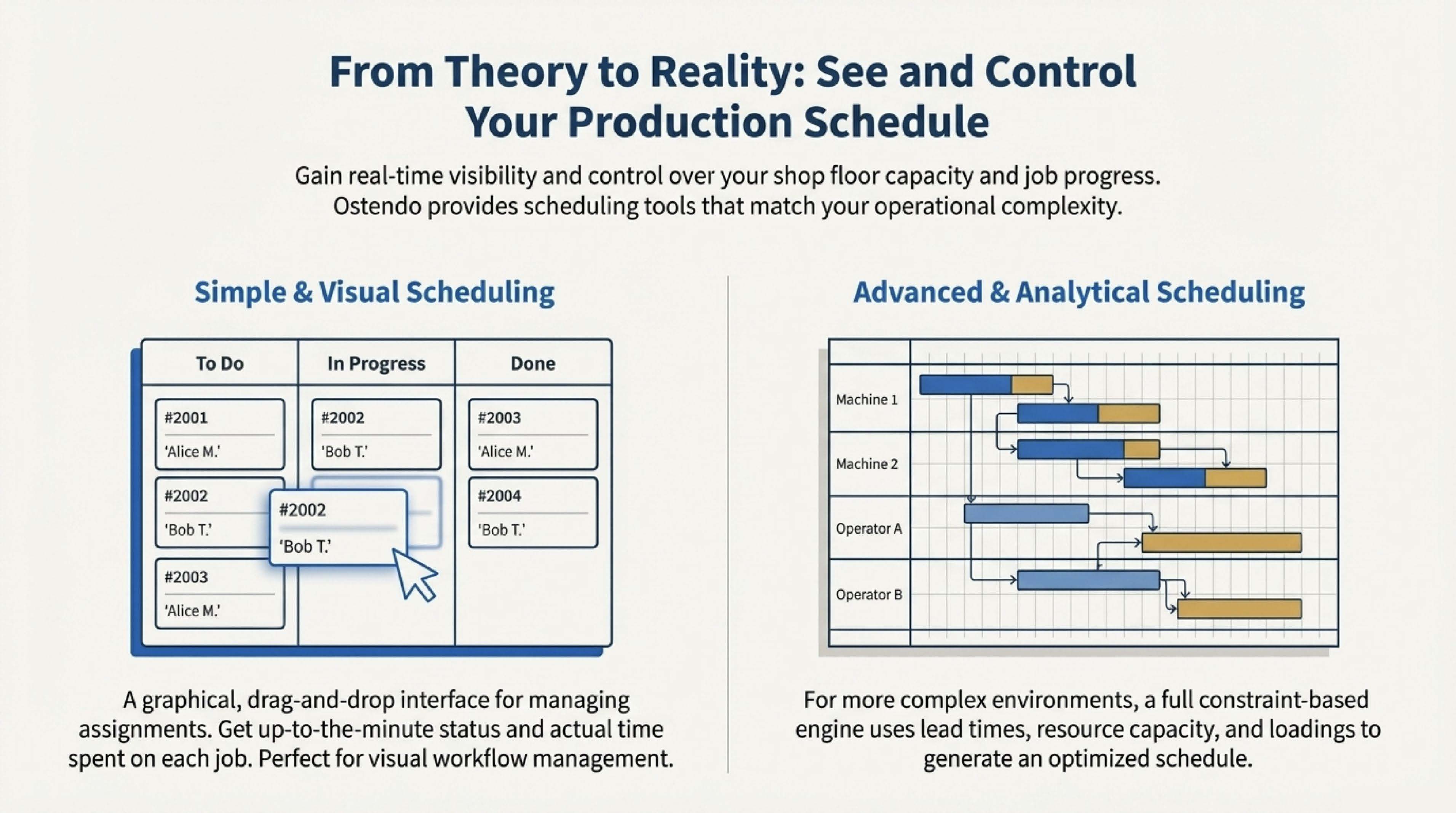 Ostendo Continuum supports a spectrum of production scheduling needs—from simple visual assignment through to advanced constraint-based planning.