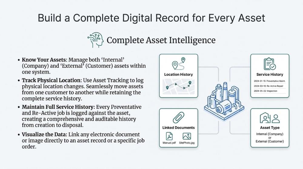 Unlimited, date-stamped history notes, documents, and images can be attached to assets or jobs, supporting reliability analysis, compliance audits, and customer reporting.
