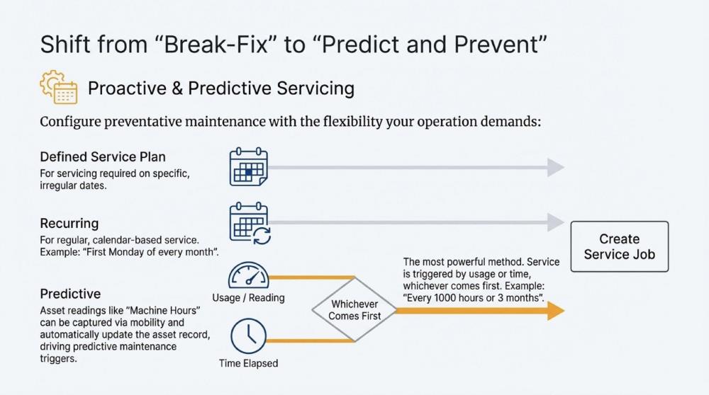 - Predictive & Usage-Based Maintenance, triggered by time and readings such as hours, kilometres, or cycles (e.g. every 1,000 hours or 3 months — whichever occurs first)